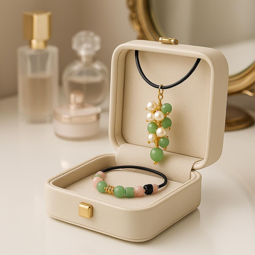 آویز گردنی مروارید و اونتورین خوشه‌ای ترکیبی هنرمندانه از زیبایی کلاسیک مروارید و انرژی مثبت سنگ اونتورین است. طراحی خوشه‌ای این آویز، جلوه‌ای خاص و منحصربه‌فرد به آن بخشیده و باعث می‌شود استایل شما چه در مهمانی‌ها و چه در استفاده روزمره، متفاوت و چشمگیر باشد.