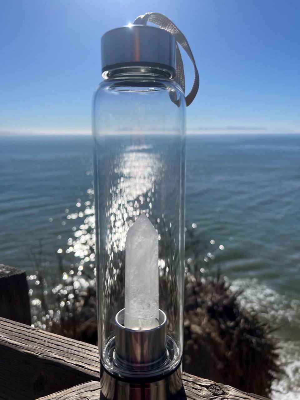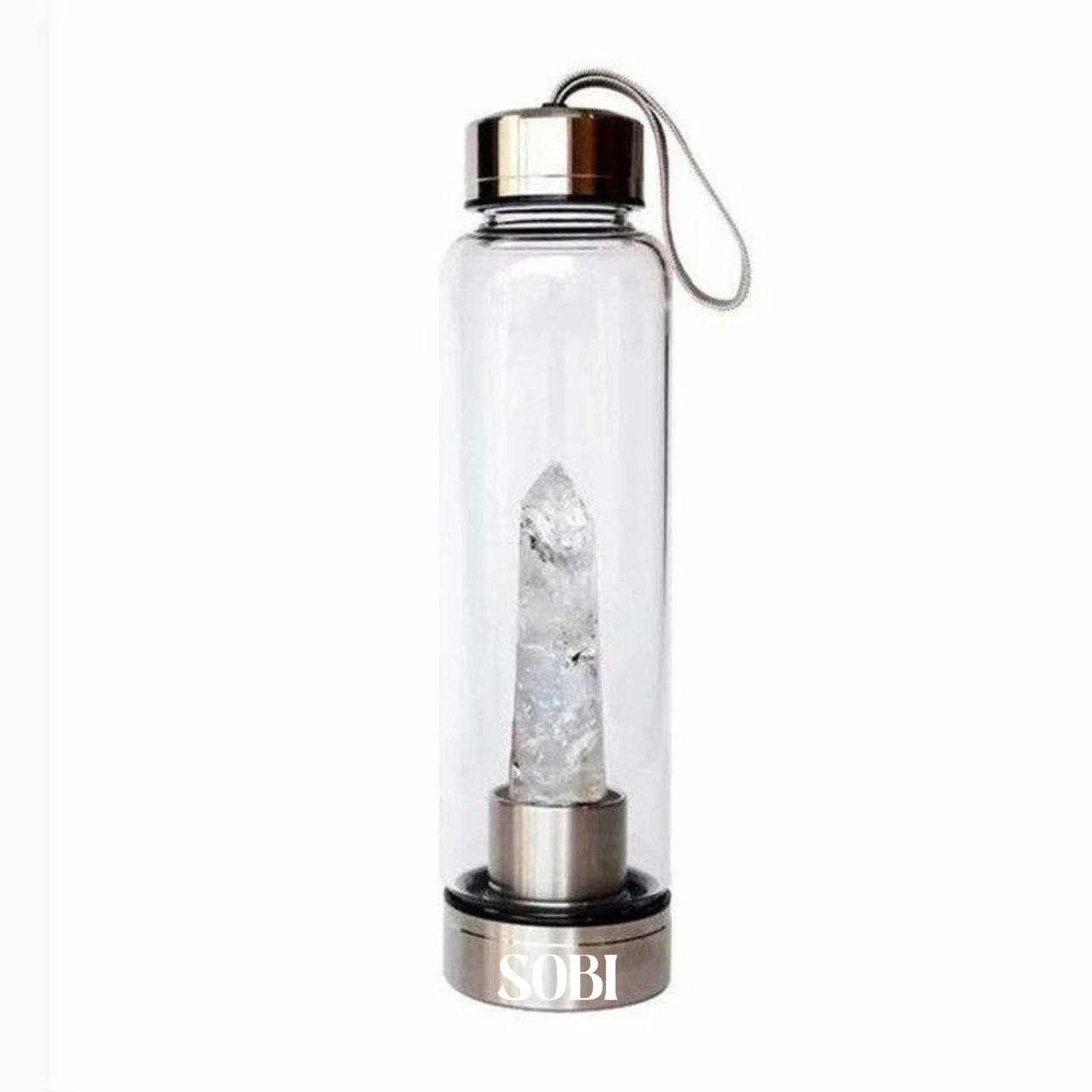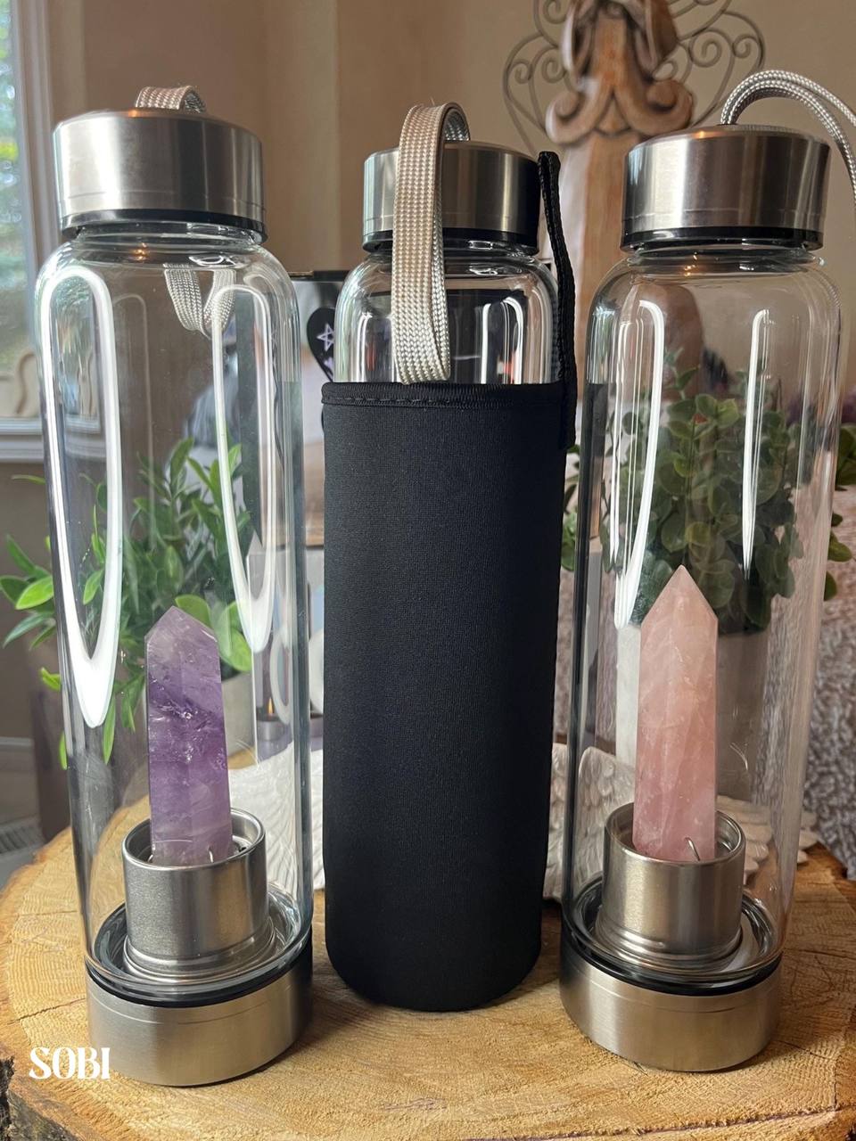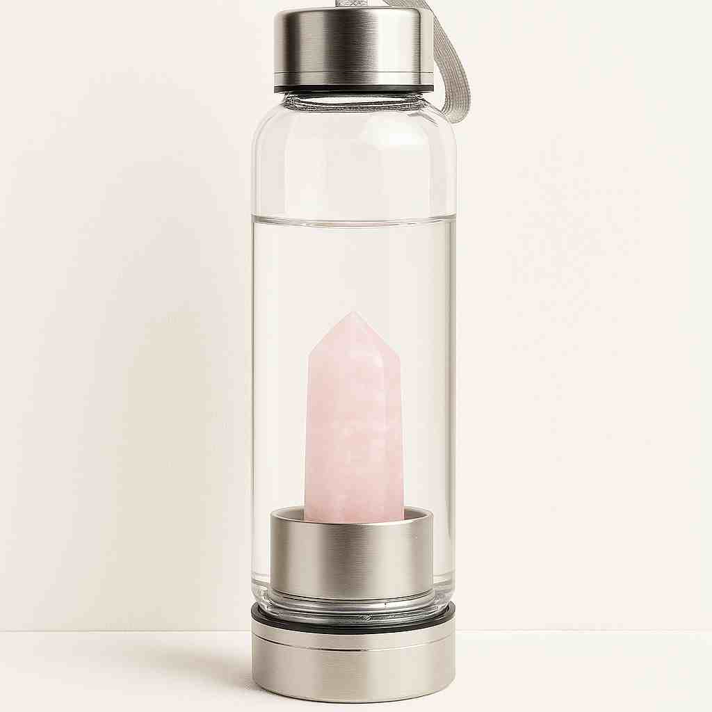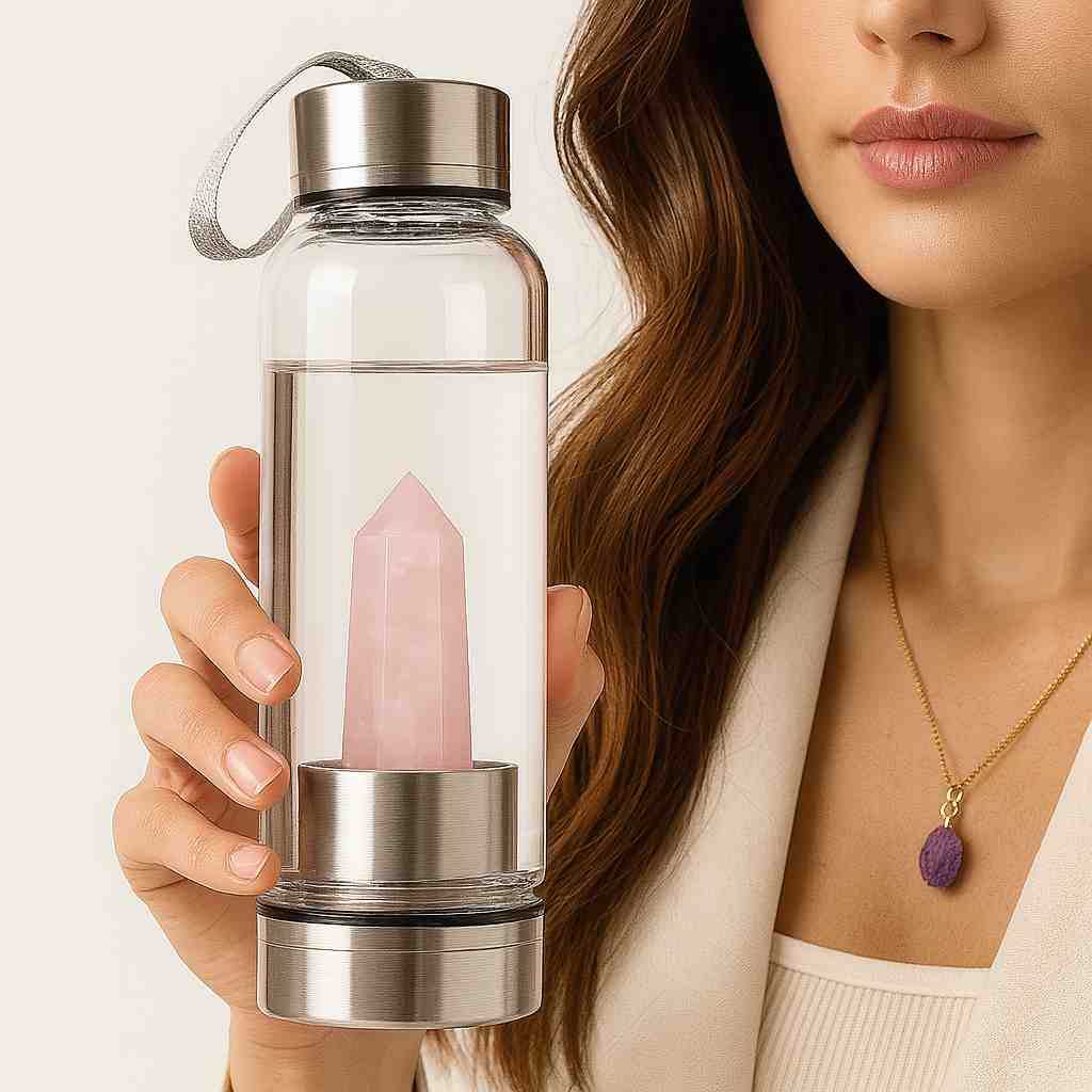 بطری کریستالی آب حاوی سنگهای طبیعی رزکوارتز و کوارتز شفاف، ابزاری زیبا و کاربردی برای نوشیدن آب با ارتعاش بالا و هماهنگی انرژی است. سنگها در محفظهای جداگانه درون بطری قرار دارند و بدون تماس مستقیم با آب، انرژی خود را به آن منتقل میکنند.