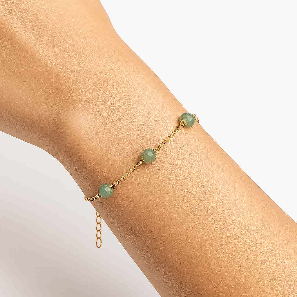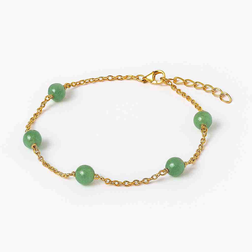 دستبند اونتورین با مهرههای گرد طبیعی پخش در زنجیر فلزی، اکسسوریای ساده، ظریف و پرانرژی برای استفاده روزمره است.