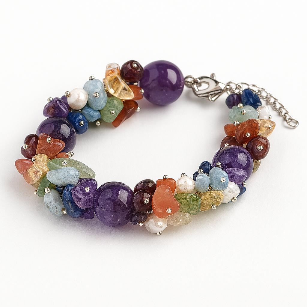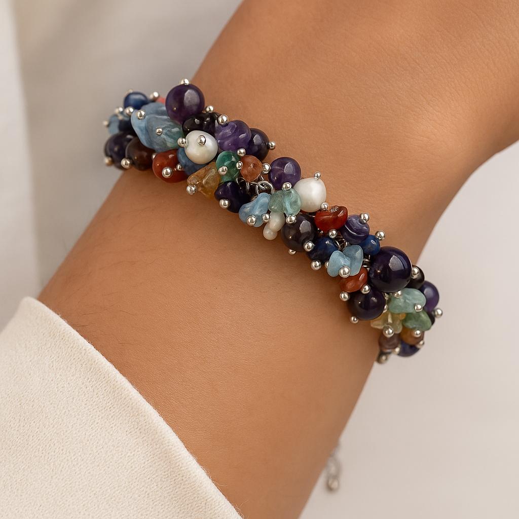 دستبند هفت چاکرا جواهری، ترکیبی هنرمندانه از زیبایی سنگهای طبیعی و خواص انرژیدرمانی آنهاست. این دستبند شامل ۷ سنگ منتخب مرتبط با چاکراهای اصلی بدن است که به تعادل انرژی، بهبود حال روحی و تمرکز ذهن کمک میکنند.