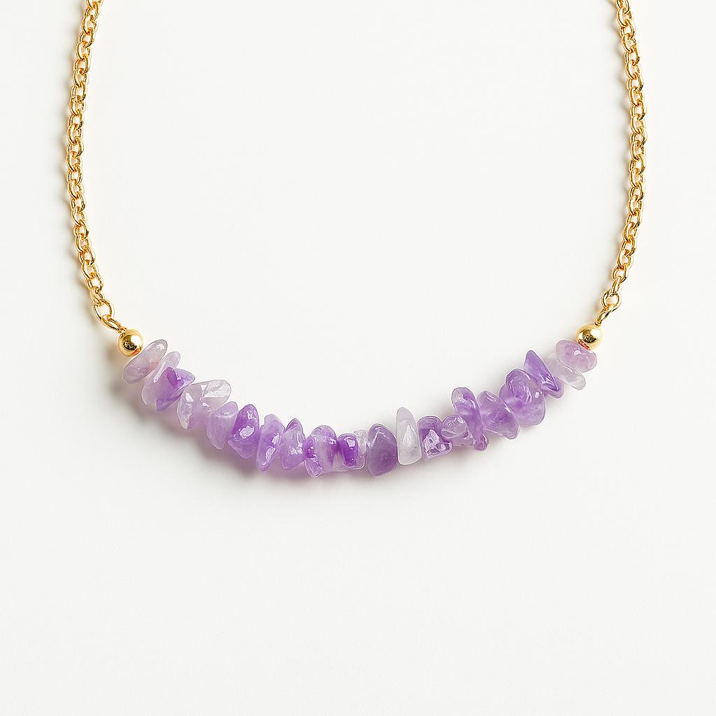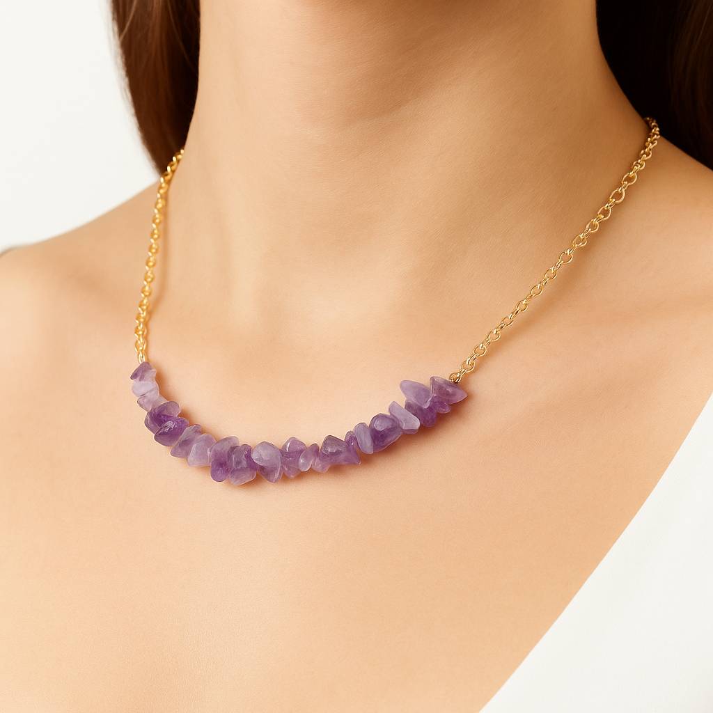 گردنبند طوقی آمیتیست، با طراحی چسبیده به گردن و استفاده از سنگ طبیعی آمیتیست، گزینهای عالی برای کسانیست که به استایلهای مینیمال، معنوی و پرانرژی علاقه دارند.