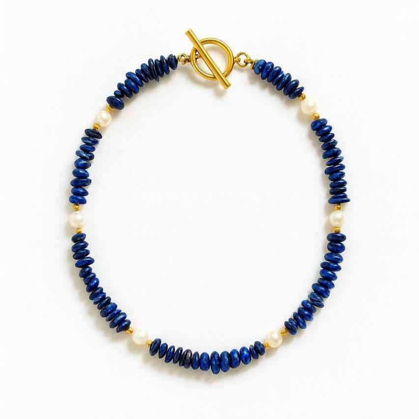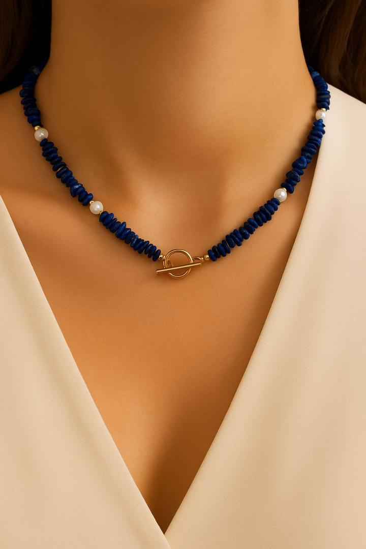 گردنبند لاجورد و مروارید با قفل T ترکیبی از انرژی معنوی، آرامش و اعتمادبه‌نفس است.