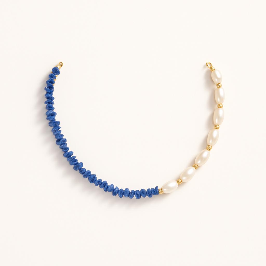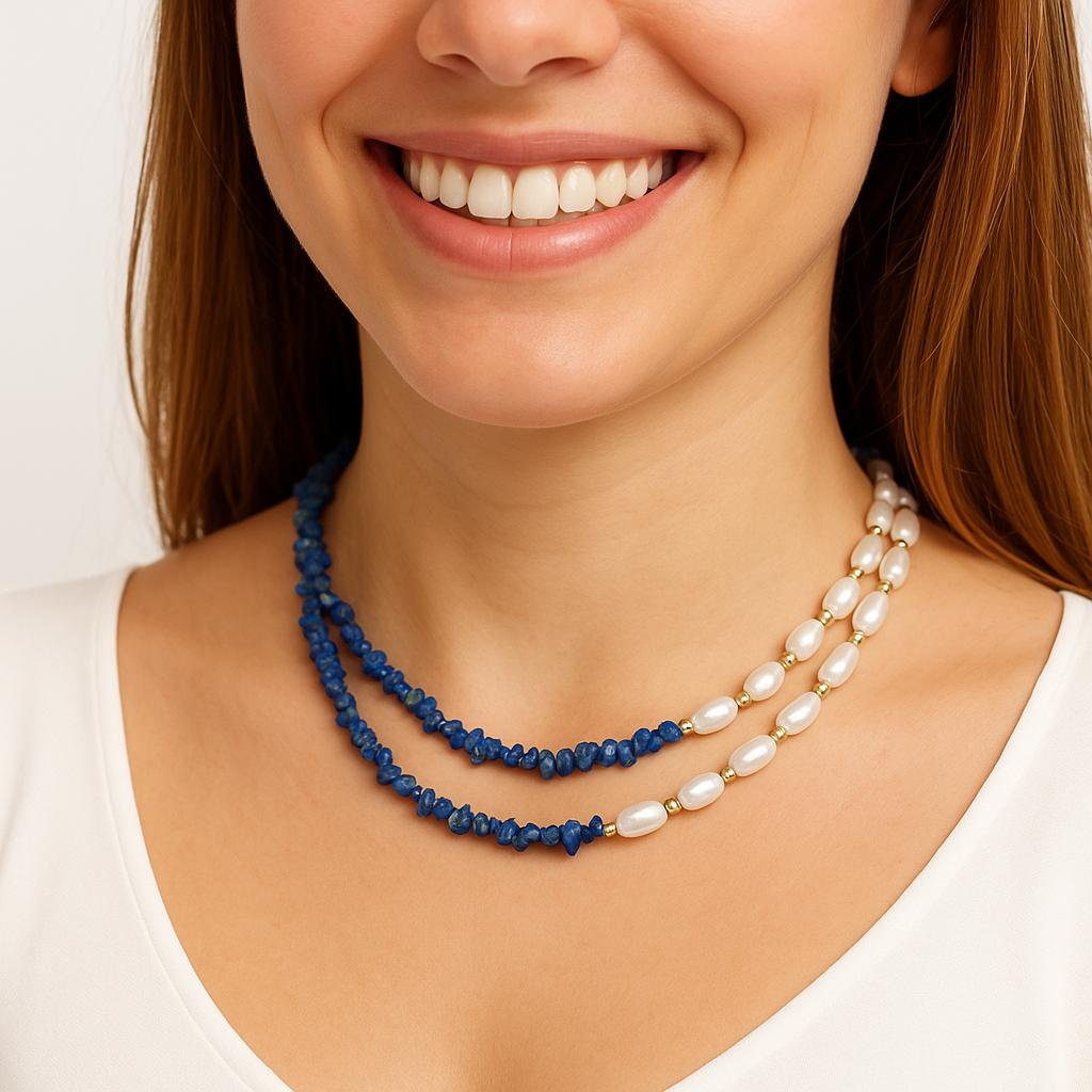 گردنبند لاجورد و مروارید تک لاین، تلفیقی از دو متریال پرانرژی و زیباست؛ سنگ لاجورد (Lapis Lazuli) که با رنگ آبی عمیق خود به‌عنوان نماد آرامش ذهن، تقویت بیان و شهود شناخته می‌شود و مروارید پرورشی که نماد لطافت، زنانگی و آرامش احساسی است.
