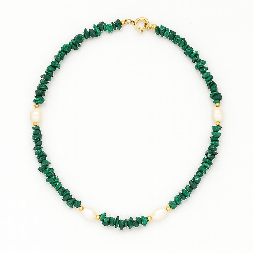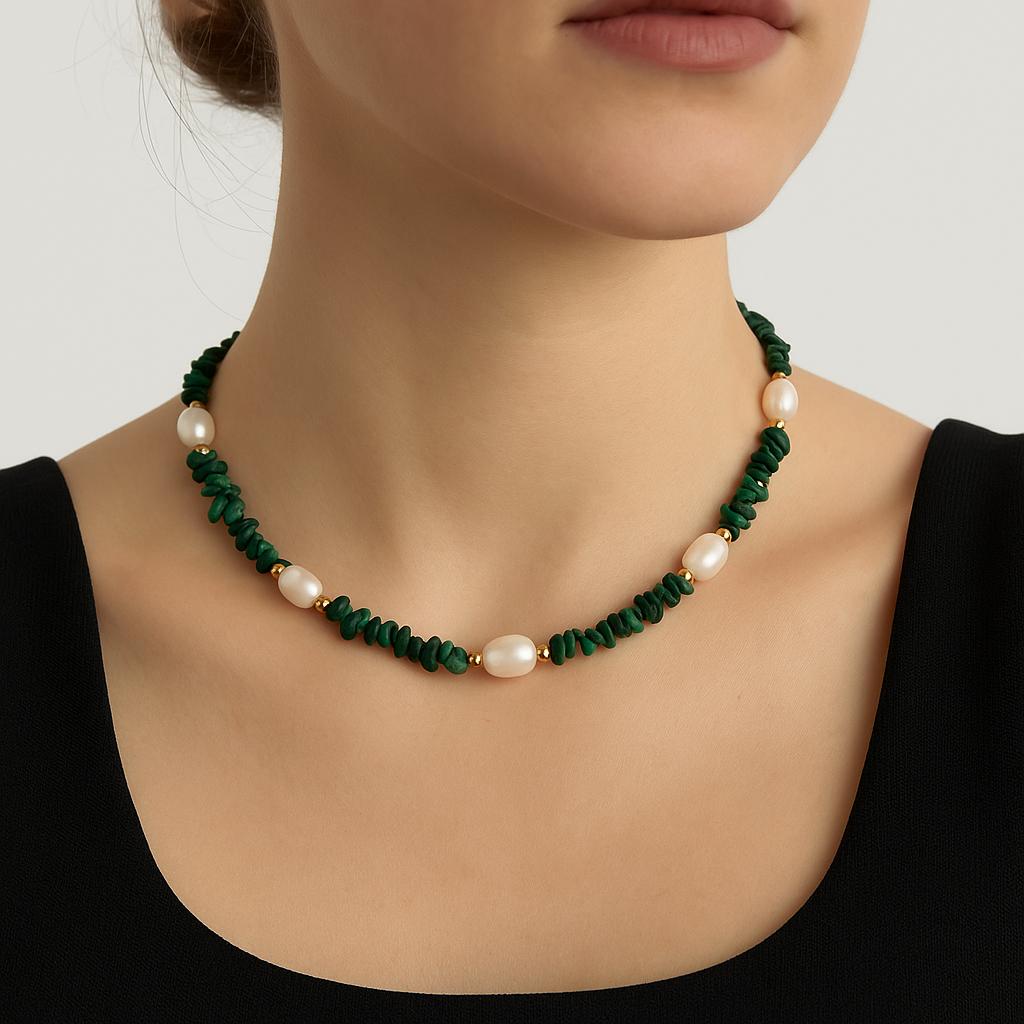 گردنبند مالاکیت و مروارید ترکیبی بی‌نظیر از رنگ سبز عمیق و مرمری سنگ مالاکیت با درخشندگی سفید و اصیل مروارید است. این گردنبند با طراحی دست‌ساز و ظریف ساخته شده و انتخابی عالی برای کسانی است که به دنبال اکسسوری متفاوت، طبیعی و انرژی‌بخش هستند.