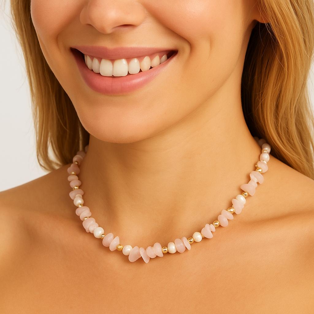 گردنبند مروارید مون استون رزکوارتز، ترکیبی دلنشین از سه سنگ زنانه، لطیف و پرانرژی است که در کنار هم، نماد عشق، آرامش، شهود و پذیرش احساسی هستند.