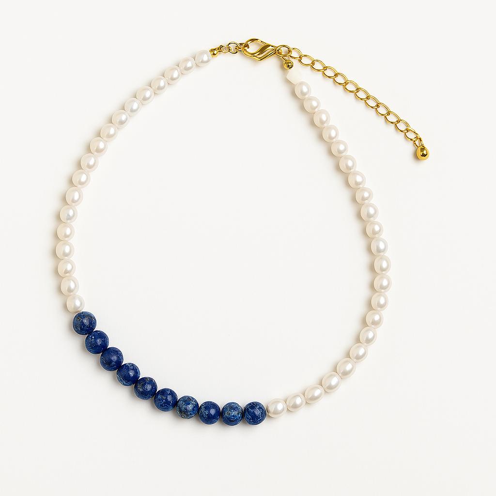گردنبند مروارید پرورشی و لاجورد، ترکیبی خاص از زیبایی کلاسیک و انرژی سنگیست که هم برای استایلهای رسمی و هم روزمره طراحی شده. این گردنبند از مهرههای طبیعی مروارید پرورشی با درخشش لطیف و سنگ لاجورد (Lapis Lazuli) با رنگ آبی سلطنتی ساخته شده که در کنار هم، جلوهای زنانه، آرامشبخش و در عین حال شیک ایجاد میکنند.