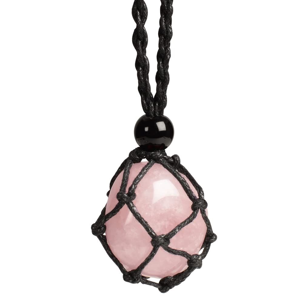 گردنبند تامبل رز کوارتز با بافت مکرومه، ترکیبی از انرژی ملایم عشق و زیبایی طبیعی است.