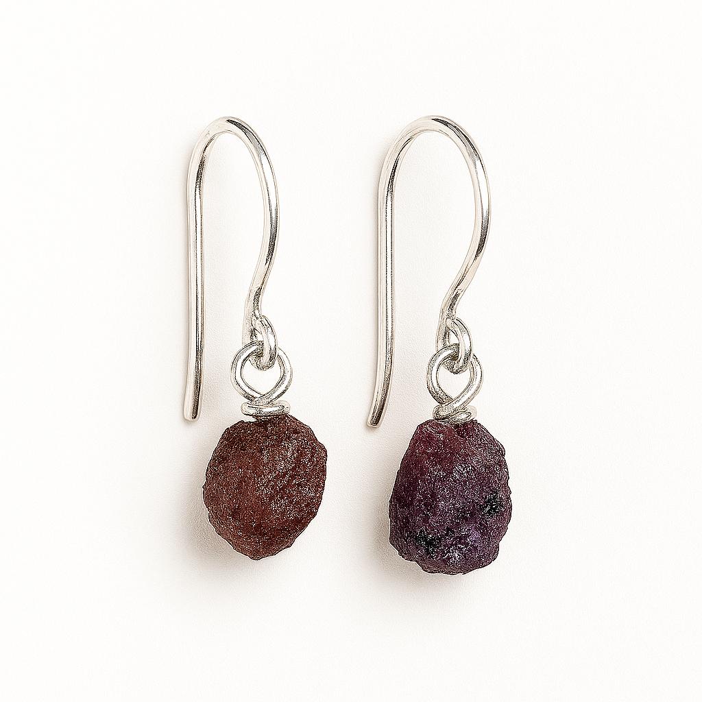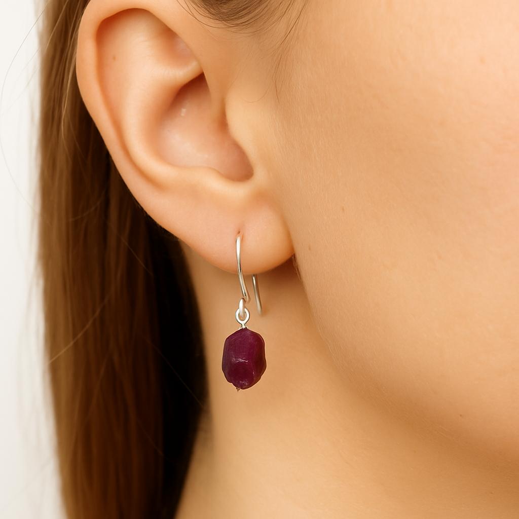 گوشواره سنگ یاقوت سرخ راف و طبیعی. مناسب افزایش انرژی، عشق و اعتمادبه‌نفس. طراحی خاص، زنانه و متفاوت با سنگ خام و فرم ارگانیک
