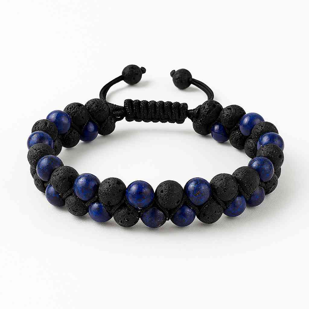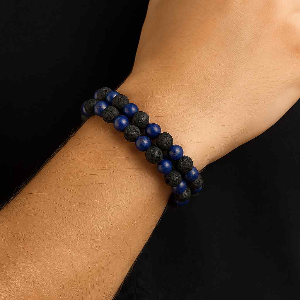 دستبند دولاین مردانه با ترکیب سنگ‌های طبیعی لاوا و لاجورد. طراحی خاص و پرقدرت برای استایل روزمره، تمرکز ذهن و تعادل انرژی.